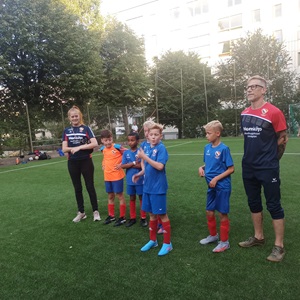 Ta med benskydd, vattenflaska, röda strumpor och blå shorts.